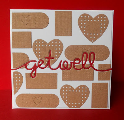 The band aids seemed an appropriate choice. I die cut them from some ranger card stock, arranged them on a square of white card and then die cut the get well word die from the panel (keeping the little bits in the loops of the letters. I die cut it again from red and pieced it back together. Both sets of dies are Paper Smooches so as it's an anything goes week on their challenge, and I'm just about in time for it, I thought I'd link it up.
